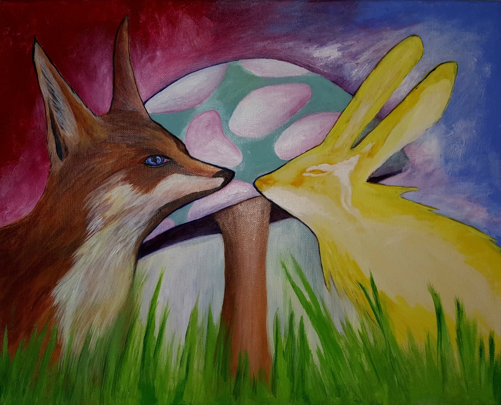 This is a digital print of the original canvas painting. Subtly inspired by Watership Down, the fox meets at the foot of the hill to speak with the hare who seeks comfort in a devastating world. The bright colors and atmosphere reflect the vibrance and strength they create by their meeting.